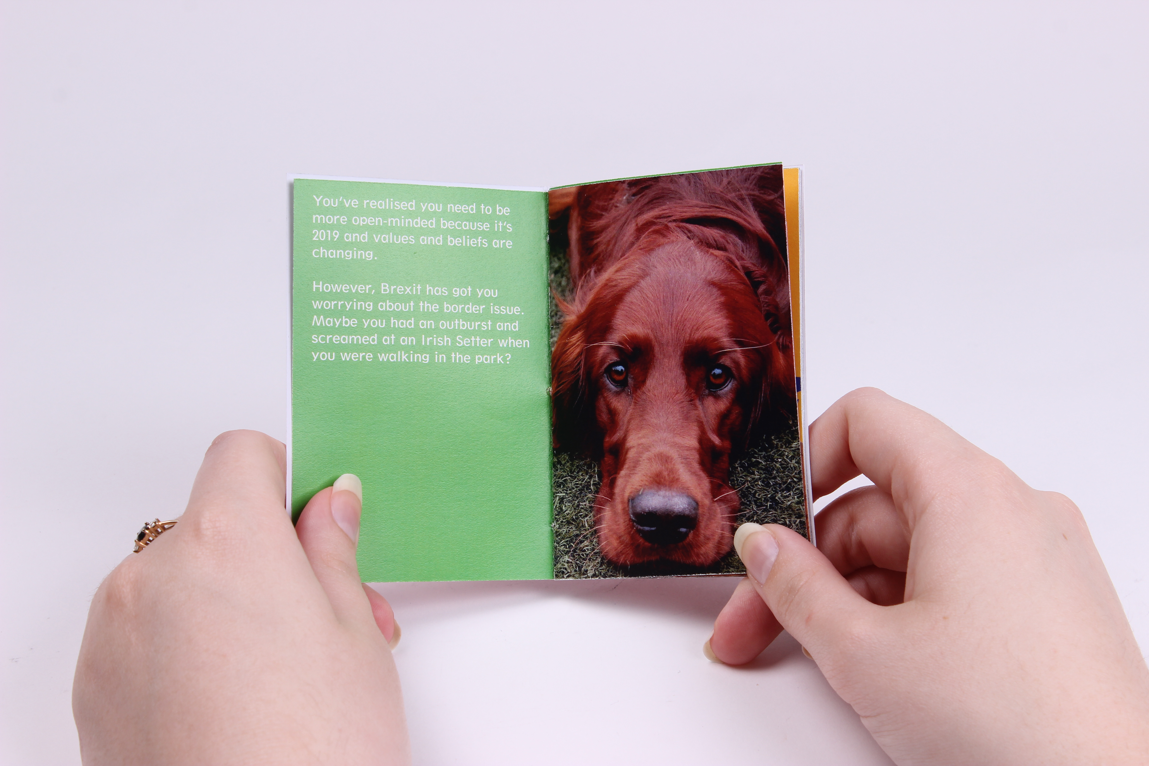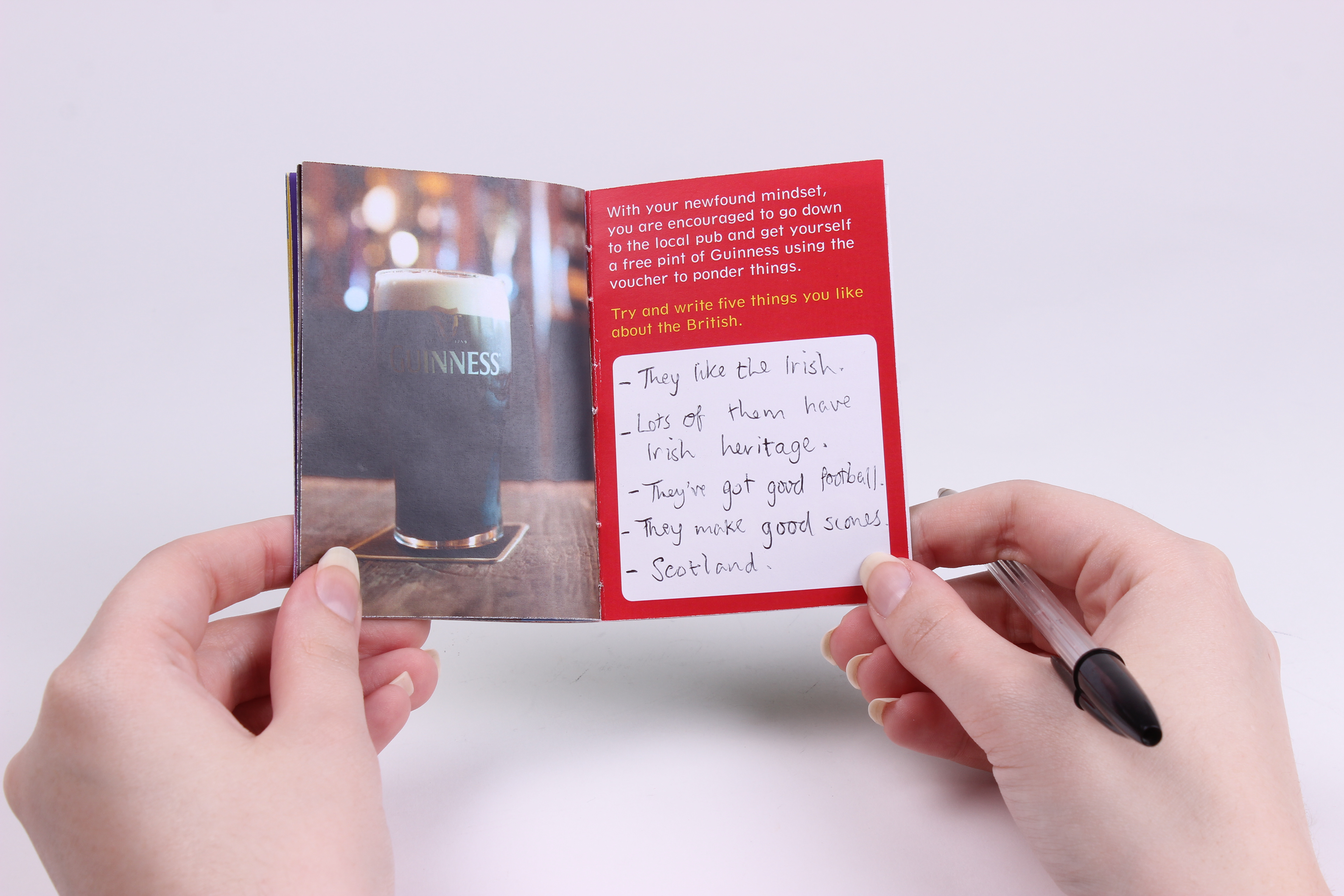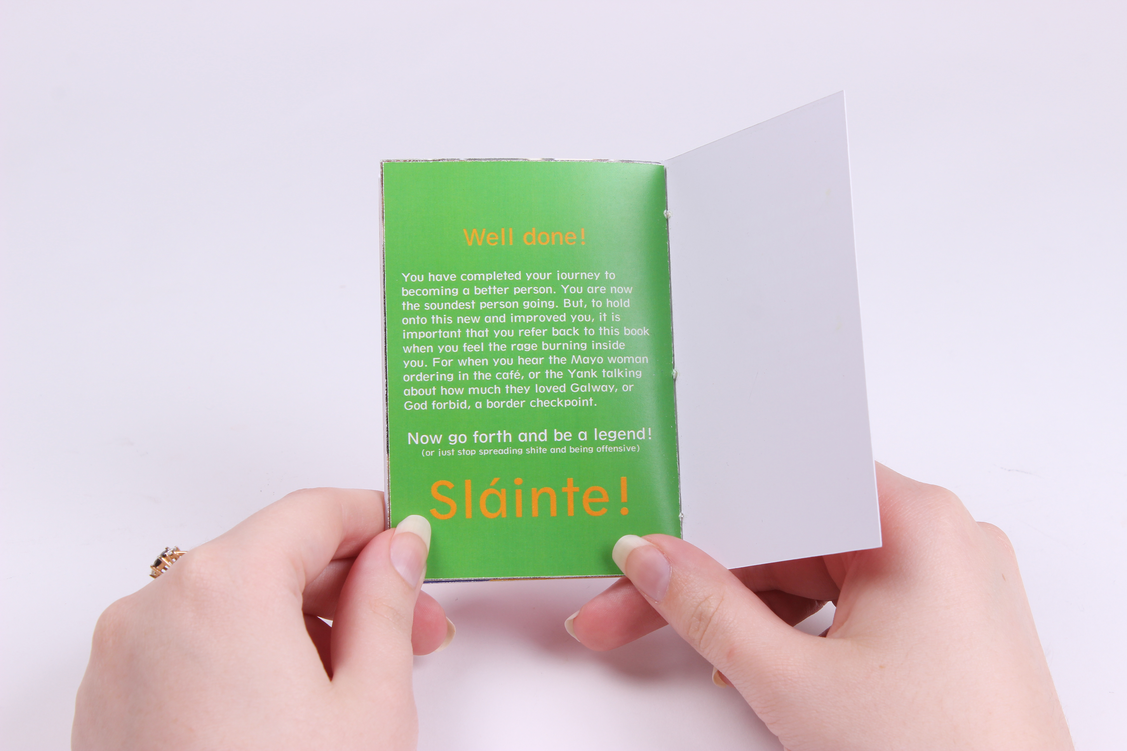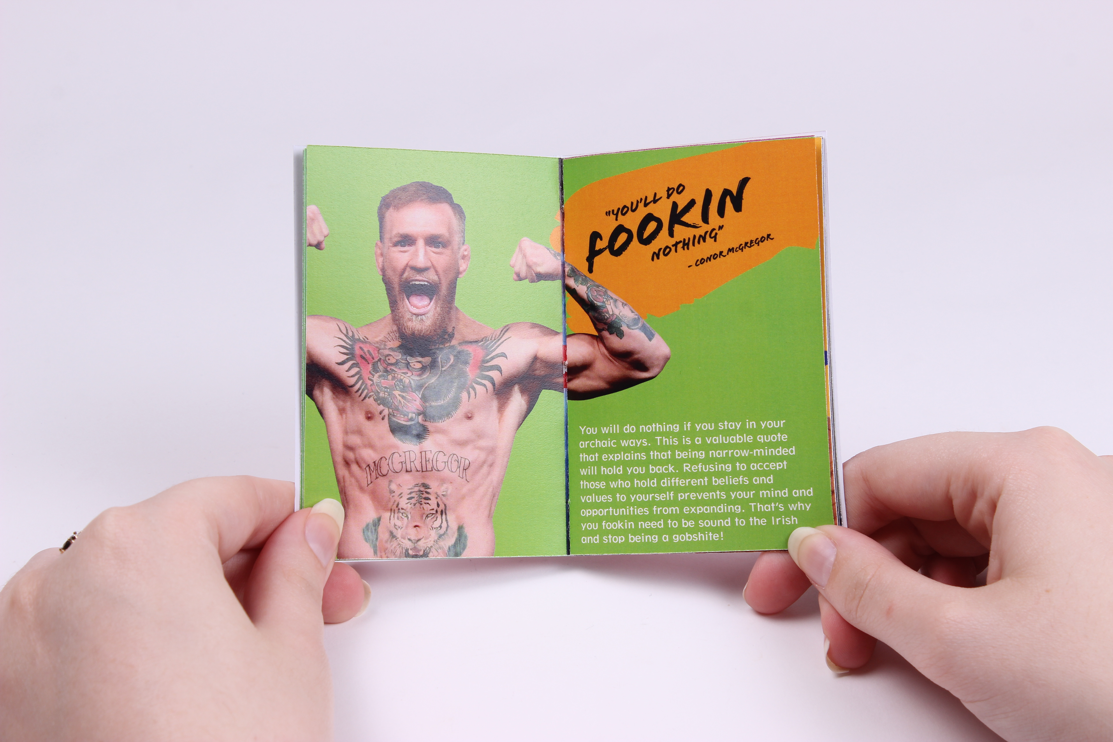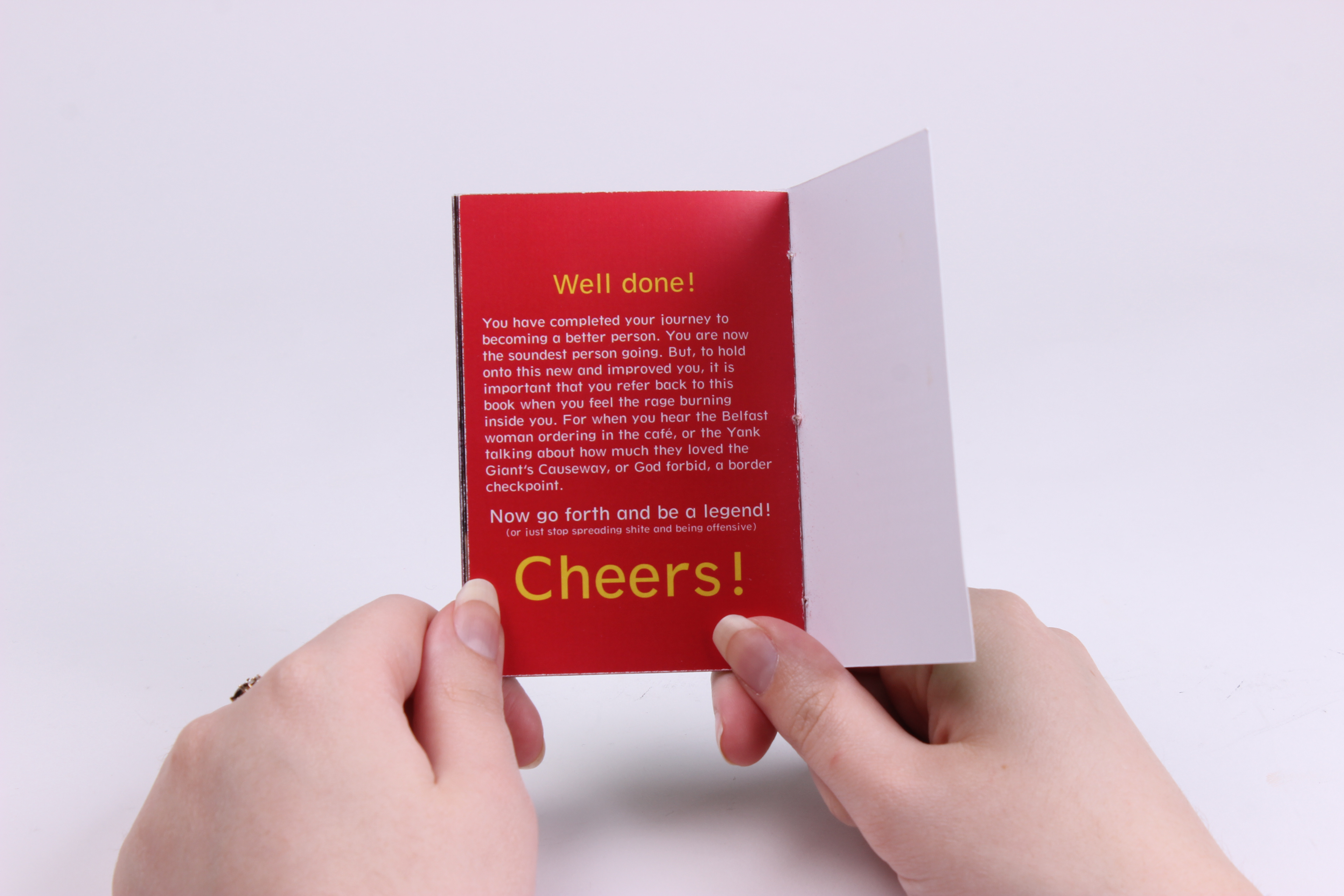 The small books' opening pages turn to the colours of the other country’s flag colours. They holds quotes from famous citizens of the other country. So, British people will receive self-help from McGregor and Saoirse Ronan that are actually mocking the person for their prejudice. Vice versa for Irish people reading quotes from Northern Ireland’s citizens.