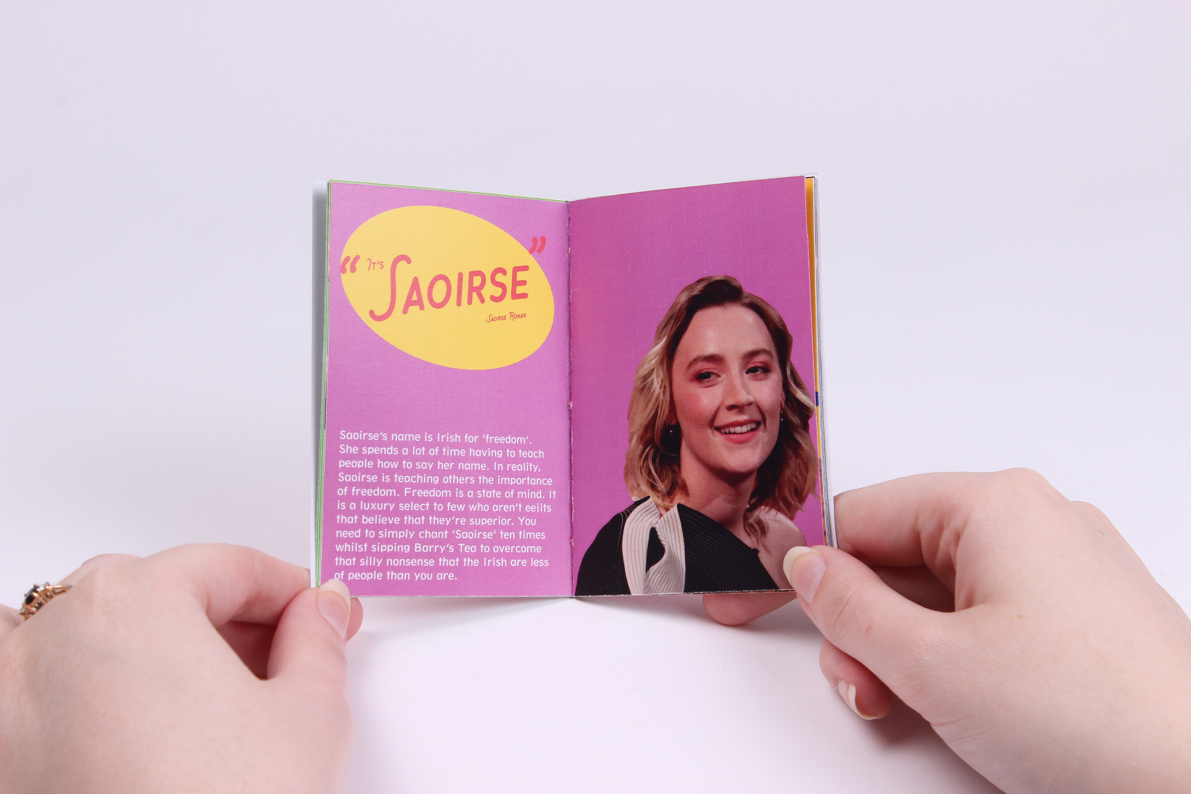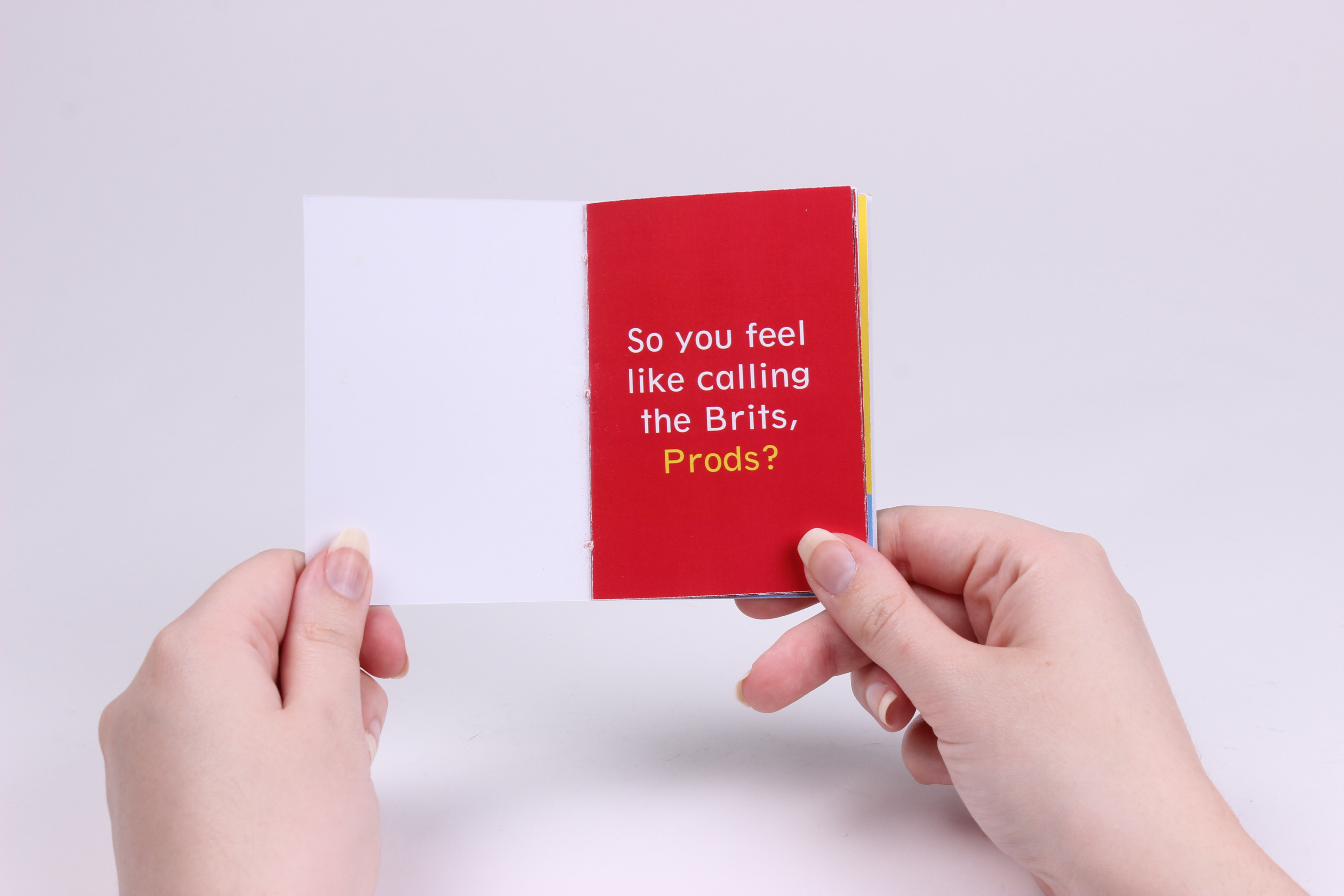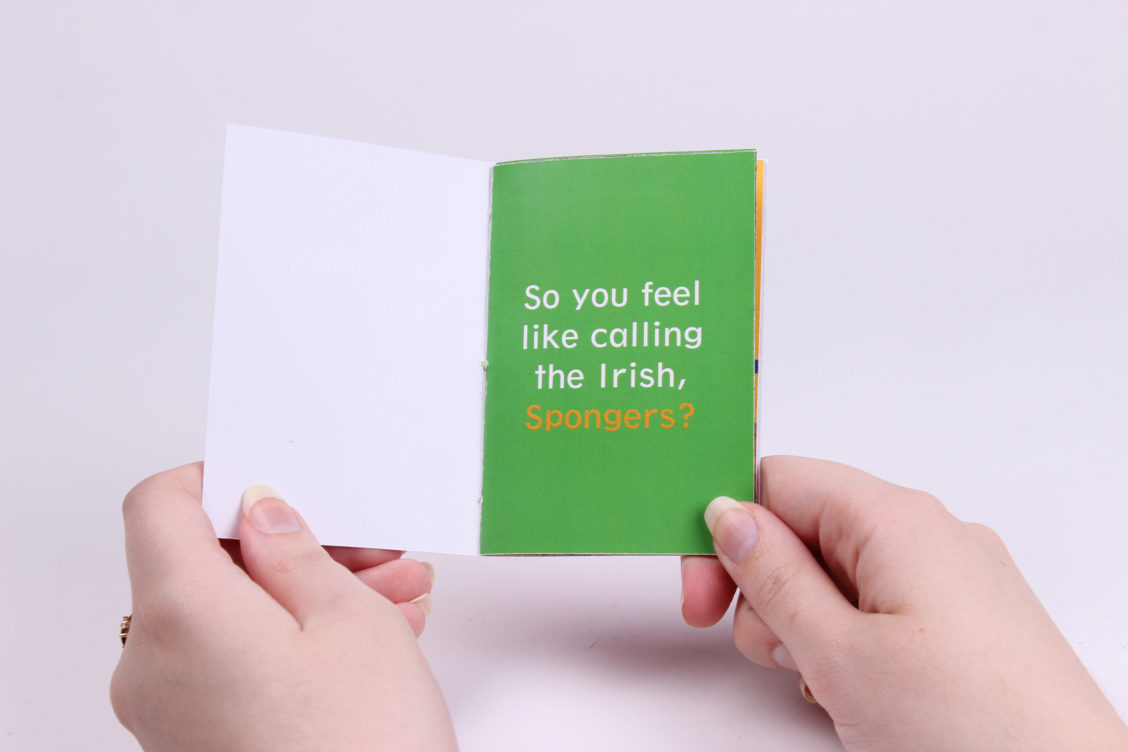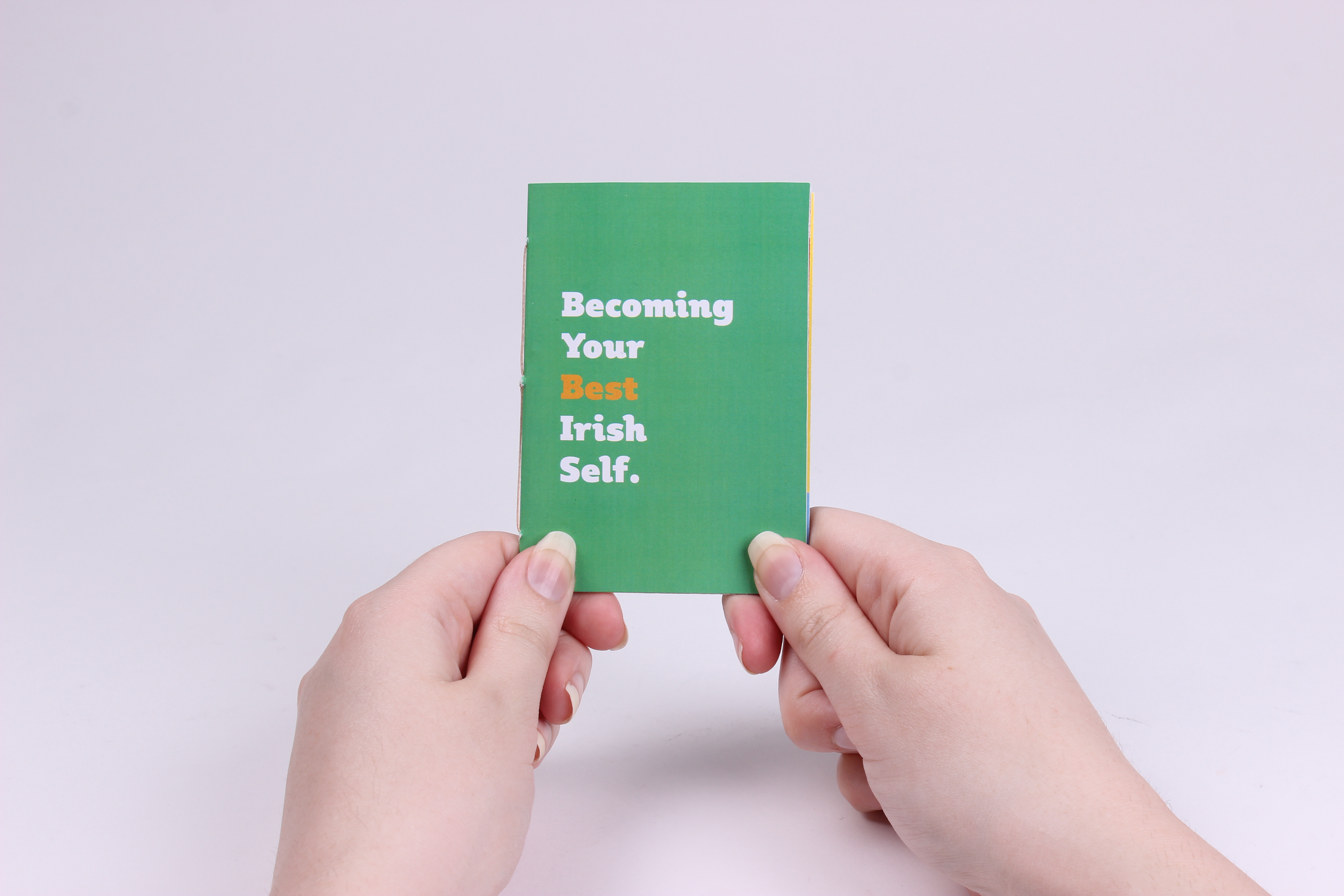 The small books' opening pages turn to the colours of the other country’s flag colours. They holds quotes from famous citizens of the other country. So, British people will receive self-help from McGregor and Saoirse Ronan that are actually mocking the person for their prejudice. Vice versa for Irish people reading quotes from Northern Ireland’s citizens.