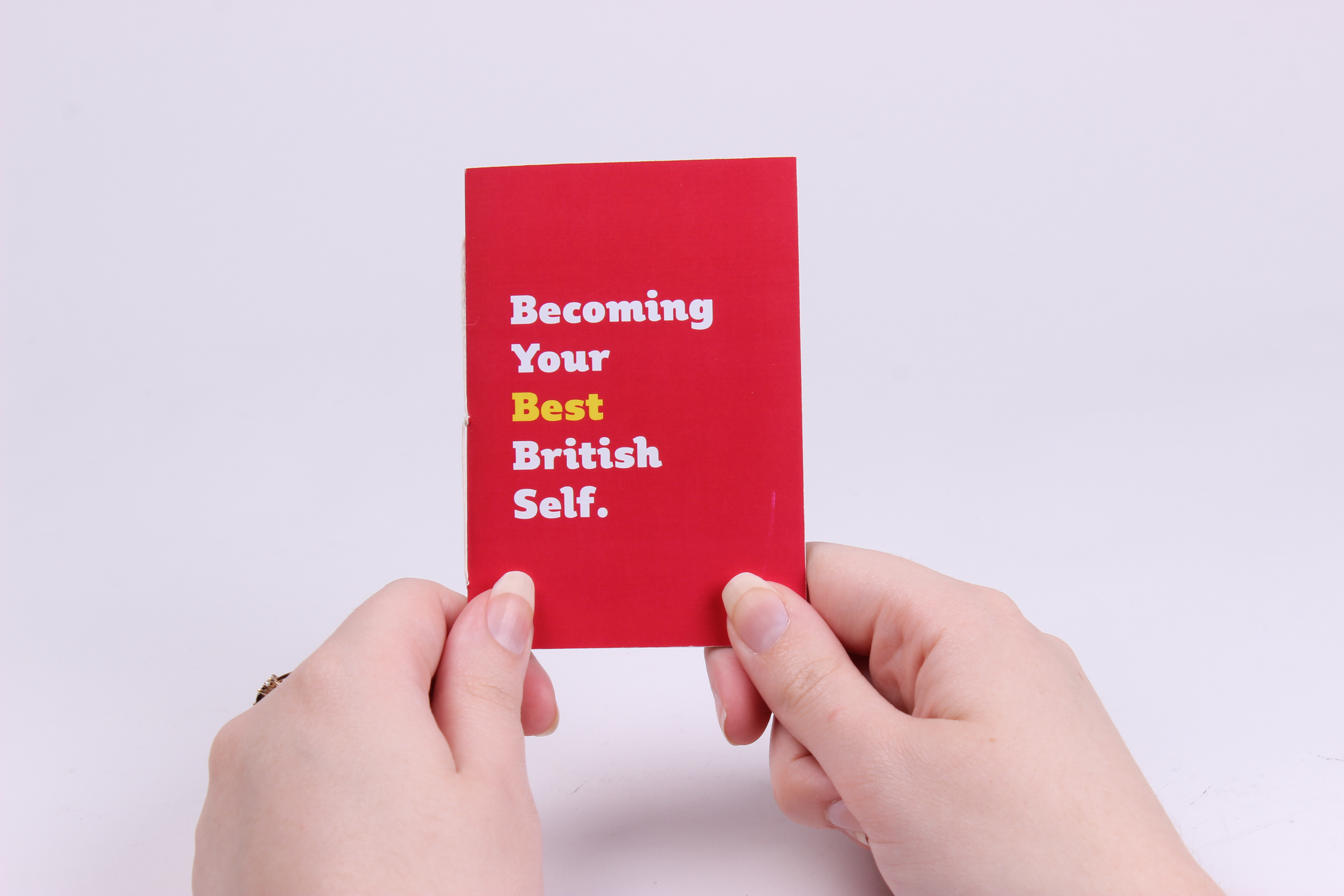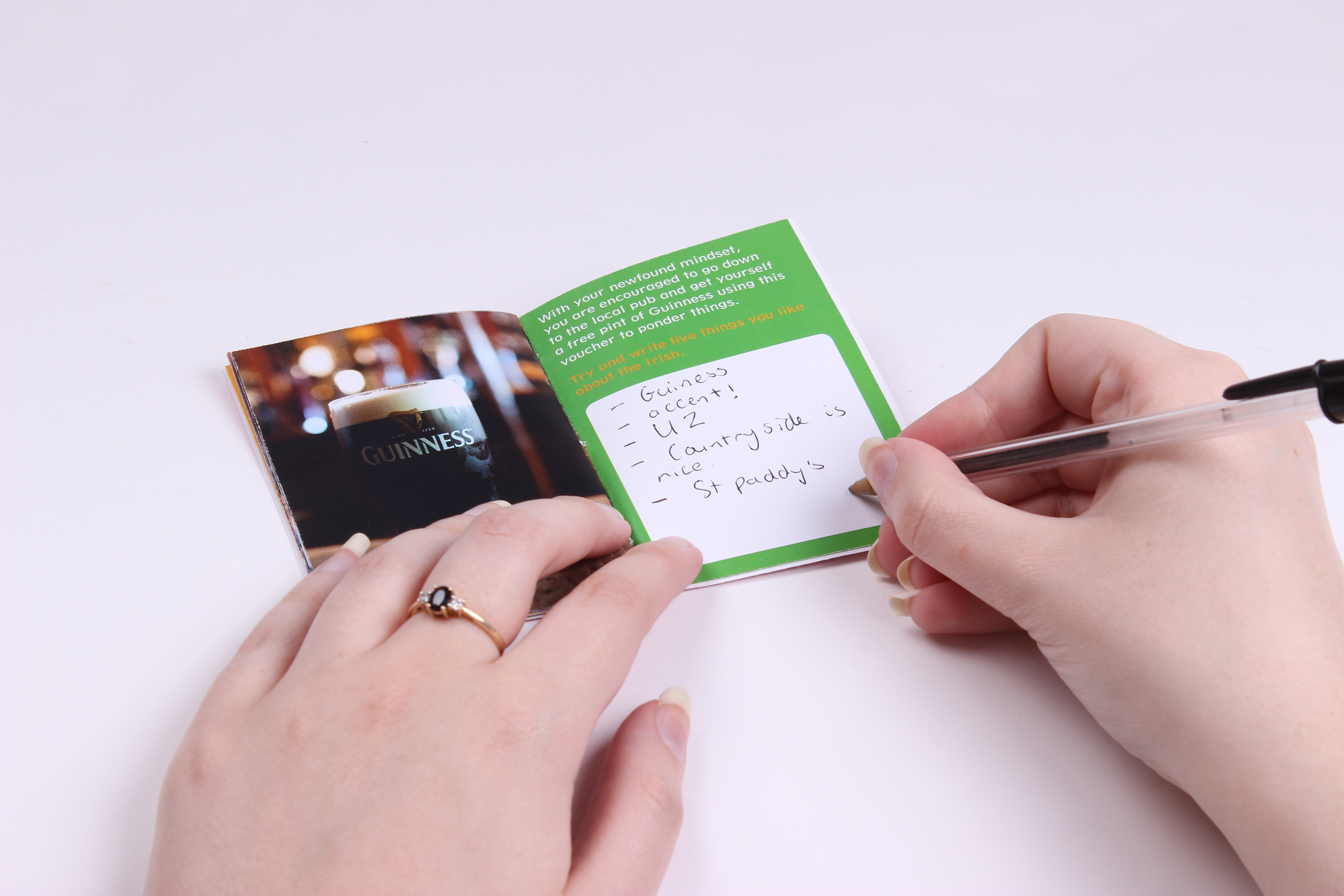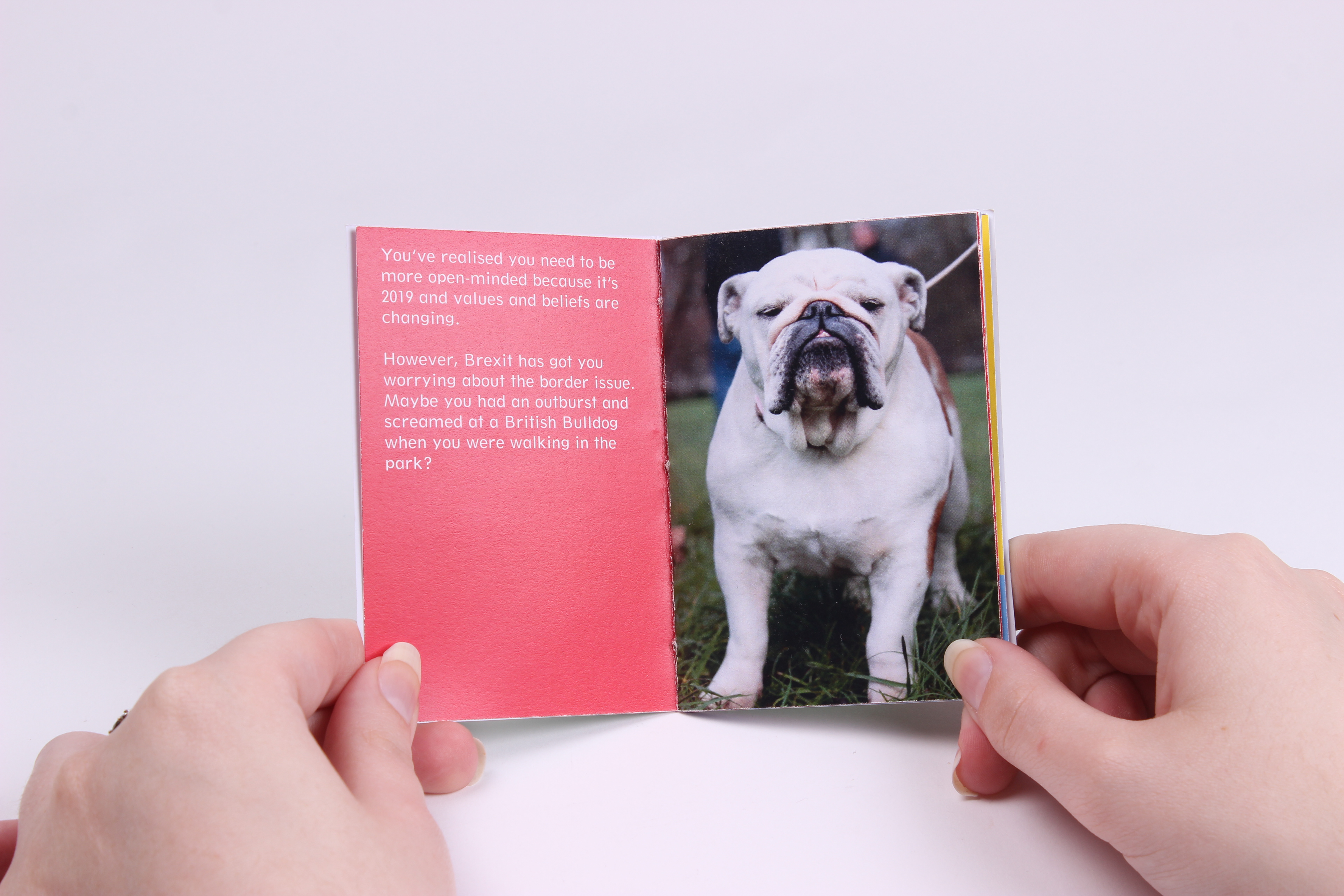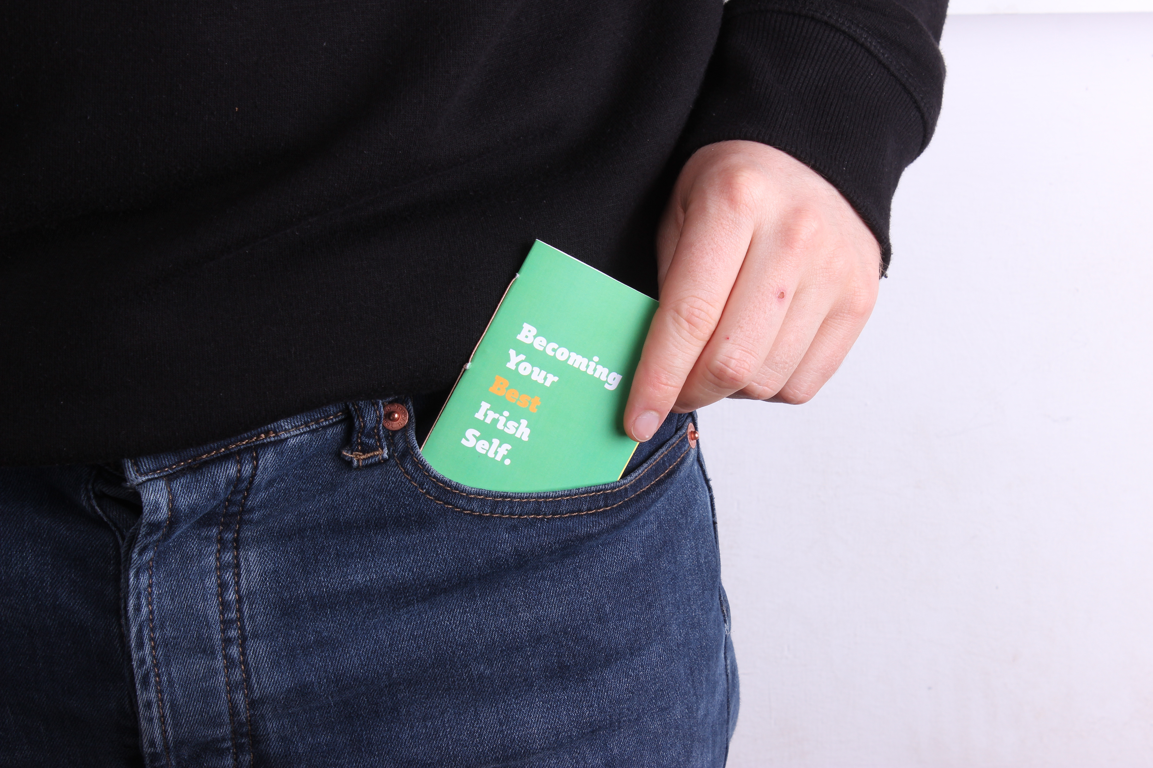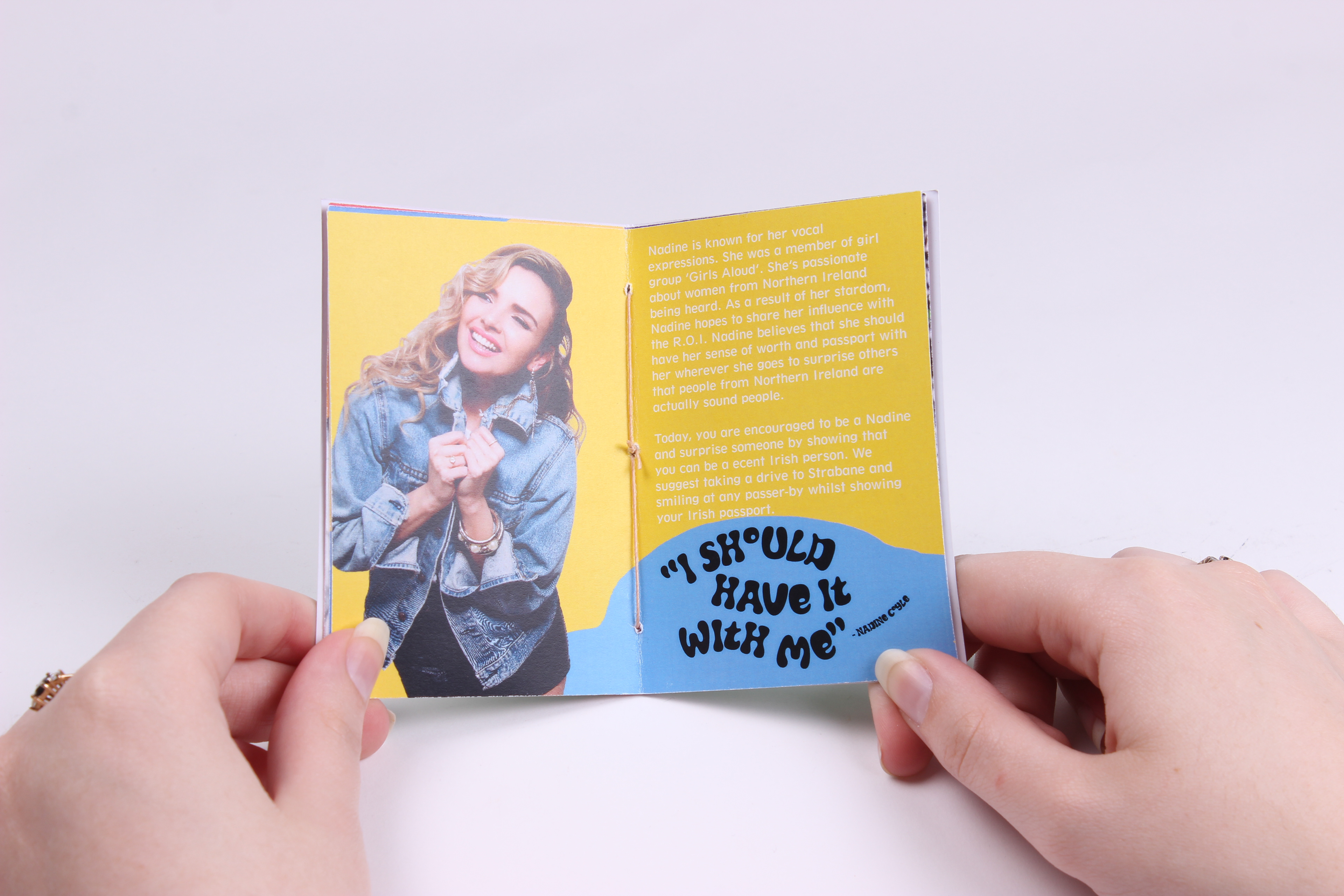 The small books' opening pages turn to the colours of the other country’s flag colours. They holds quotes from famous citizens of the other country. So, British people will receive self-help from McGregor and Saoirse Ronan that are actually mocking the person for their prejudice. Vice versa for Irish people reading quotes from Northern Ireland’s citizens.