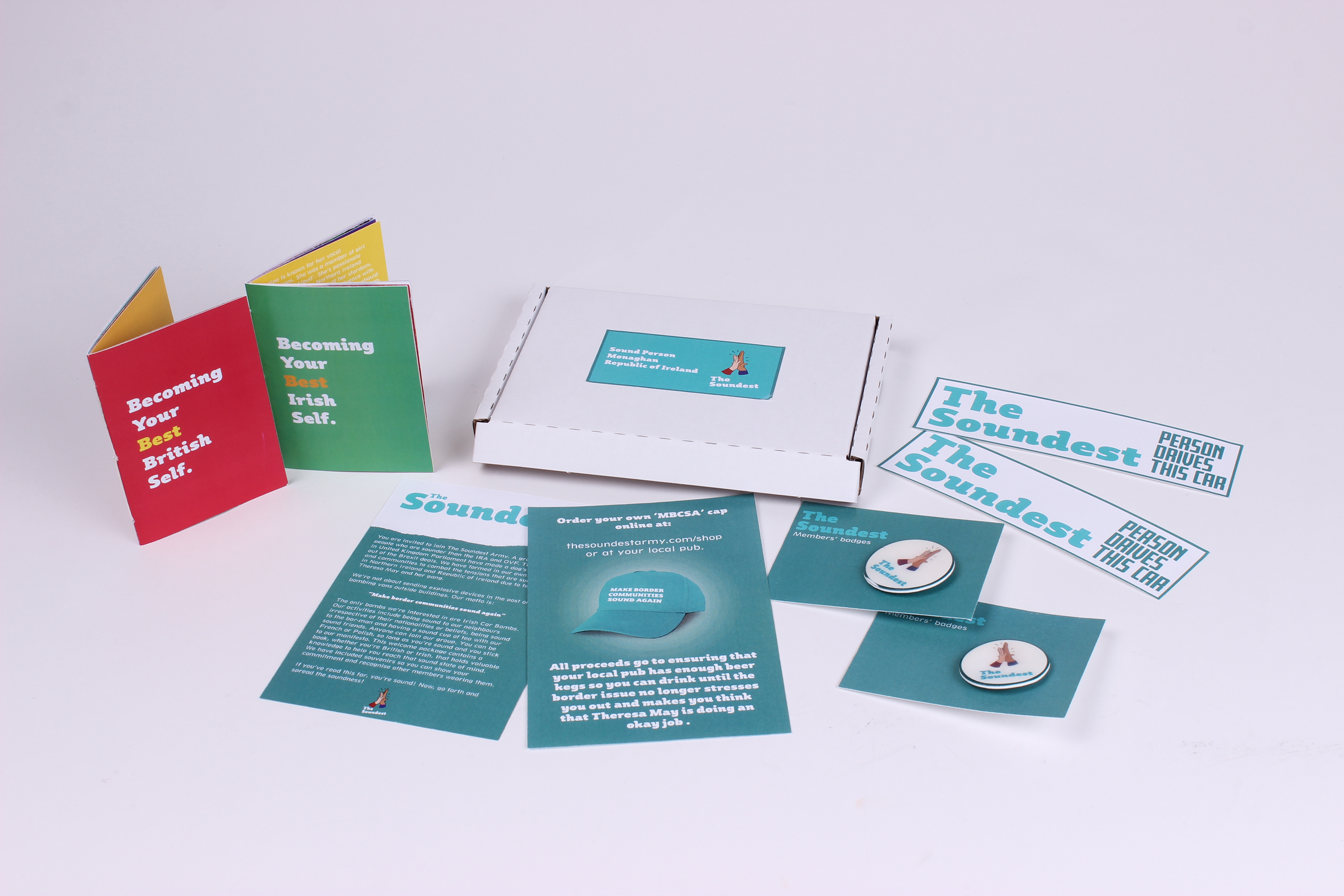 Homes along the border communities will receive packages with goodies from a satirical radical group called The Soundest Army. It consists of car stickers and badges to show your affiliation and a message and manifesto from the group. There is also a small self-help book depending, whether you’re British or Irish that helps centre you and become your best self.
